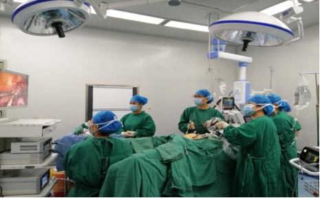 患者入院后,妇科团队非常重视,立即组织专家进行会诊、病例讨论。专家们一致认为由于患者比较肥胖,腹壁脂肪厚约7cm,肿瘤大而且部分已脱至阴道内堵住宫颈口,加之有严重贫血、高血压等疾病,如果采用开腹手术,术野暴露不清晰,容易伤及输尿管及子宫动静脉,缝合难度大止血不彻底,术后并发症多,伤口难以愈合、脂肪液化等等……,且患者担心腹壁脂肪厚导致手术后伤口裂开等风险意识较强烈,经过妇科专家团队详细的会诊、讨论,全面评估患者的病情、麻醉及手术风险,精心制定了手术方案和预案,进一步与患者及家属沟通,完善相关检查、输血纠正贫血、控制血压,同时行诊断性刮宫子宫内膜活检排除子宫内膜不良病变。