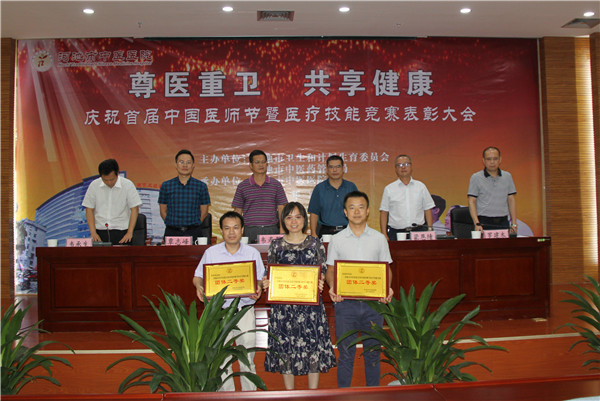 2018年8月17日,河池市中医医院召开庆祝首个中国医师节暨医疗技能竞赛表彰大会。表彰该院开展的首个中国医师节医疗技能竞赛健康促进活动中获奖的团体及个人,大力弘扬“敬佑生命、救死扶伤、甘于奉献、大爱无疆”的卫生健康崇高精神,营造全社会“尊医重卫,共享健康”的良好氛围。表彰大会由市中医医院副院长韦承生主持,河池市卫生和计划生育委员会党组成员、市中医药管理局局长韦寿繁,河池市中医医院党委书记、院长谭翱等领导班子成员及医务人员400多人参加了表彰大会。