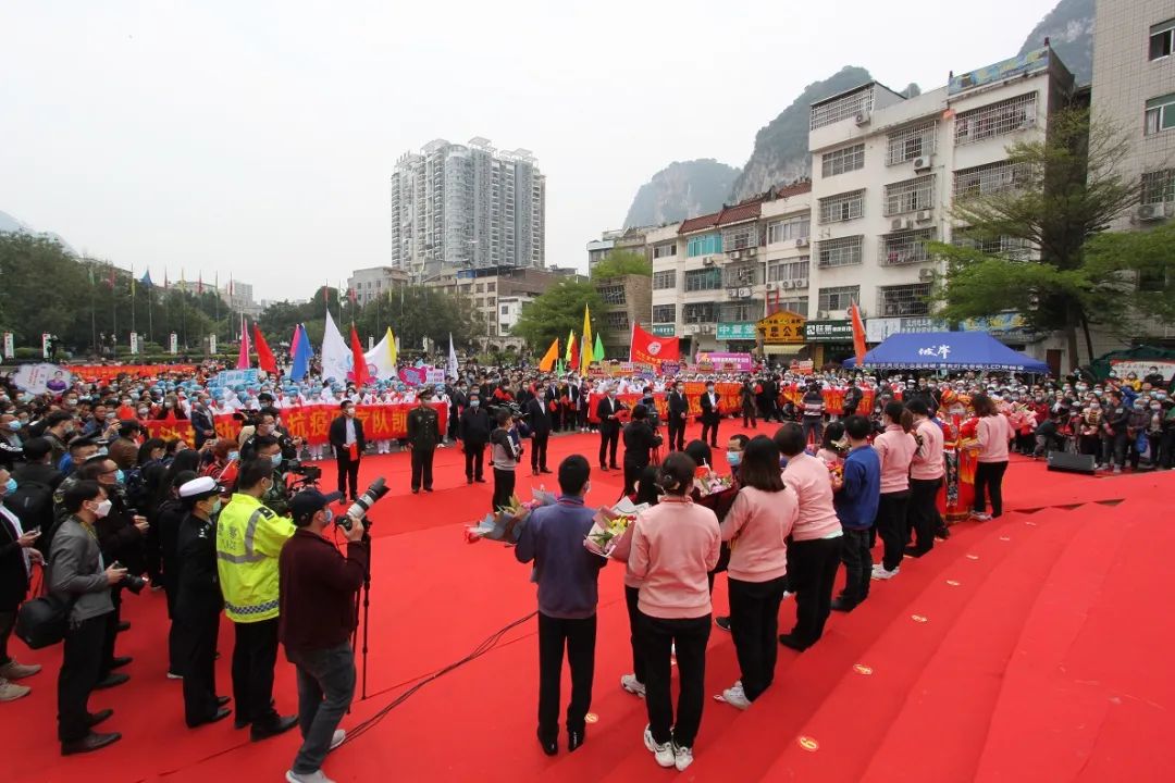 我市派出的援助湖北医疗队于2月19日逆行出征驰援武汉抗疫。在武汉战斗的35个日夜里,河池援助湖北抗疫医疗队与广西第六批医疗队的战友们累计收治新冠肺炎患者34人,其中重症32人、危重症2人,24人痊愈出院,0人感染。3月24日,在武汉圆满完成救治任务后,河池援助湖北抗疫医疗队回到南宁进行为期14天的隔离休整,并于4月8日荣归河池。