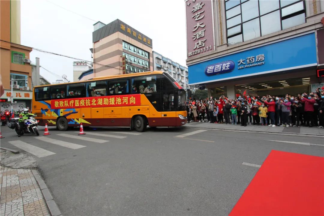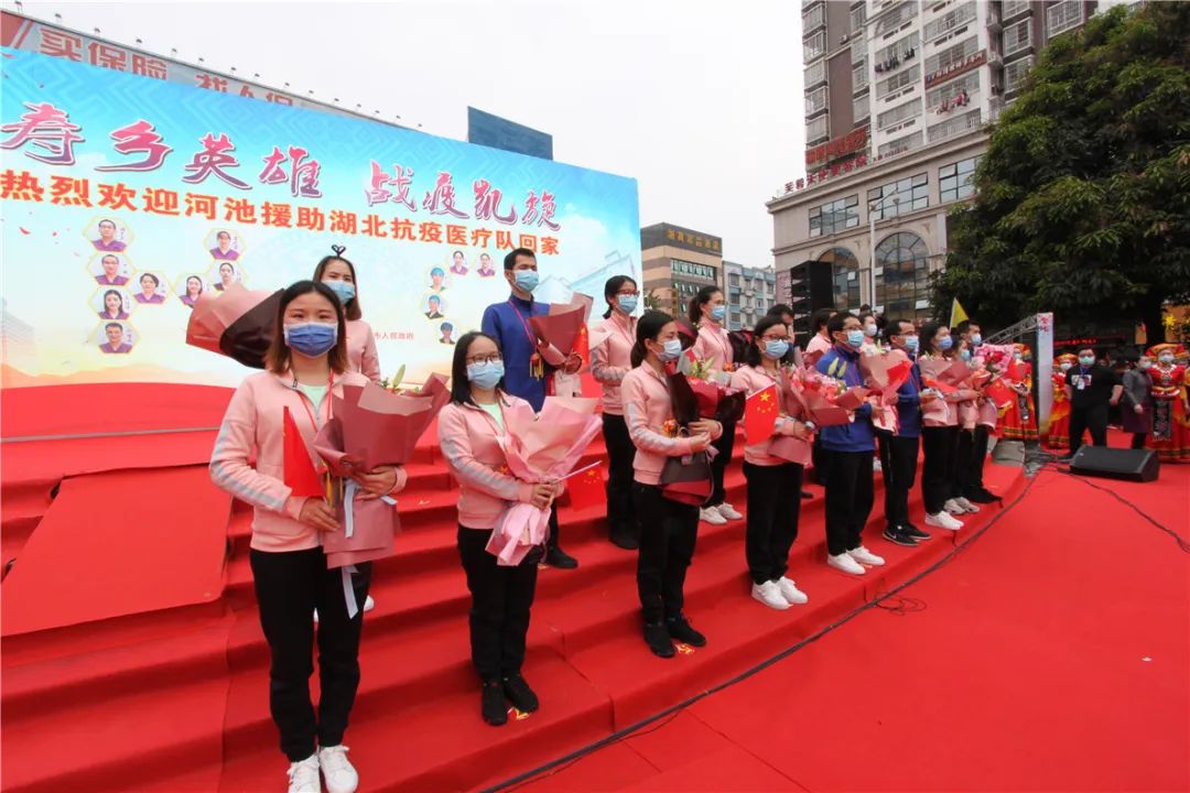 4月8日上午,我市在市文化广场举行仪式,迎接援助湖北抗疫医疗队17名医护人员凯旋。市委、市政府以礼宾规格热烈迎接英雄们回家。