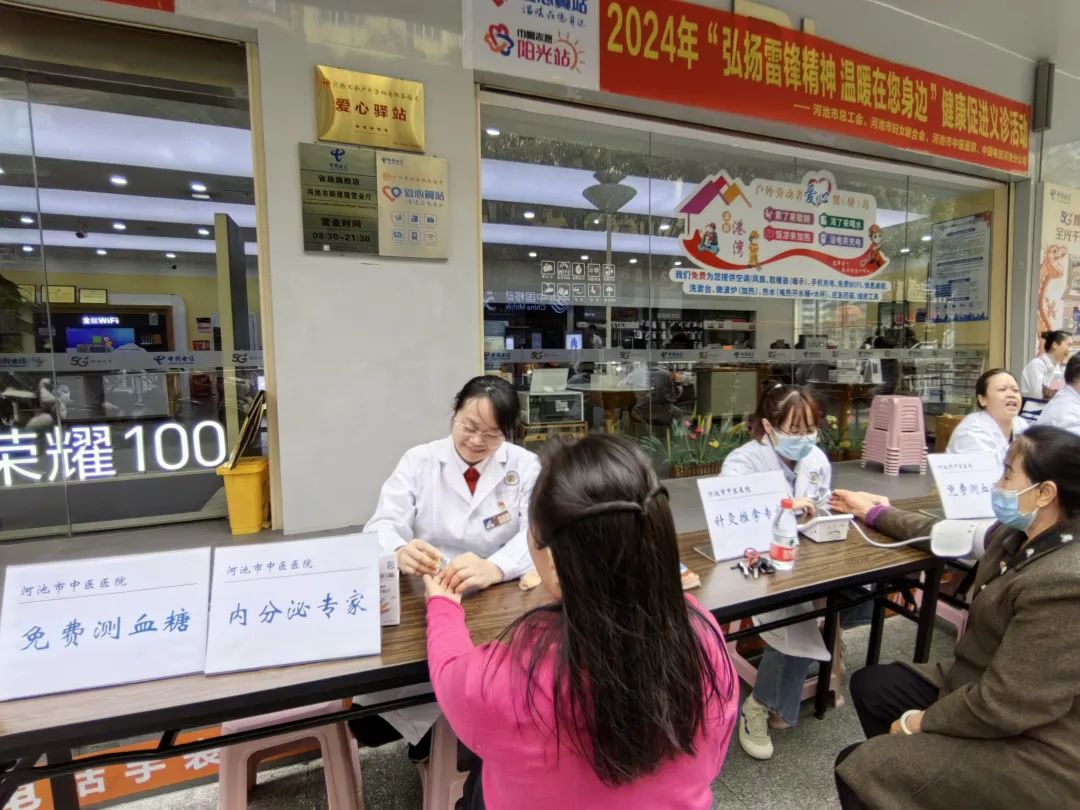 2024年3月12日,河池市中医医院联合河池市总工会、河池市妇女联合会、中国电信河池分公司,到金城江区电信广场开展健康促进义诊活动,深入学习贯彻党的二十大精神,大力传承弘扬雷锋精神,秉承全心全意为人民服务的初心,充分发挥中医药壮瑶医药特色技术服务百姓健康公益效能。